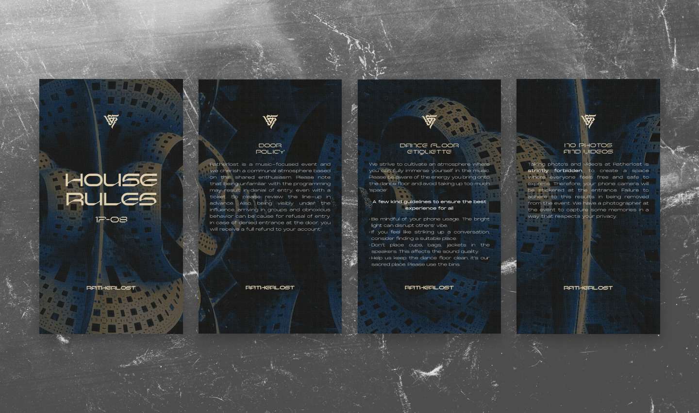 RatherLost needed to stand out in Amsterdam's competitive techno scene while conveying the edgy, dark, and industrial essence of their events. They required a cohesive brand identity that would resonate with techno enthusiasts and translate effectively across various digital platforms.
